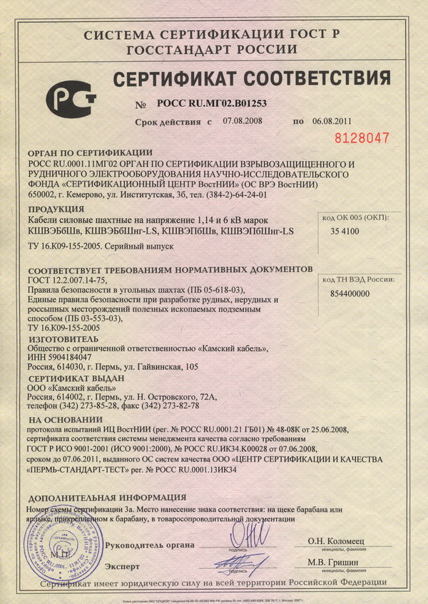 Кабели марки КШВЭПбШНГ-LS предназначены для прокладки по вертикальным выработкам шахт в электрических сетях на номинальное переменное напряжение 6 кВ частотой 50 Гц на основных жилах и до 220 В на вспомогательных жилах.